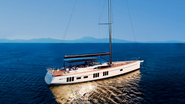 Key features include an elongated coachroof and a sizable aft deck for storing a ‘decent’ tender. There are also fold-down bulwarks to enlarge the relaxing area and under-deck stowage for jetskis.