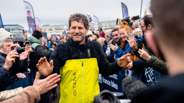 Caudrelier meets the crowds at the end of the Arkea Ultime Brest. Photo: Eloi Stichelbaut/polaRYSE/Gitana