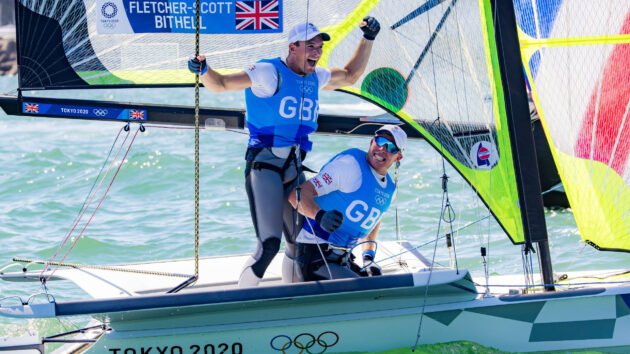 Fletcher (left) and Bithell (right) picked up gold in the 49er at the 2020 Olympics. Photo: Sailing energy / World Sailing