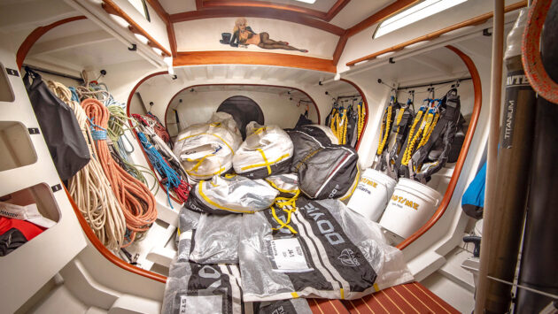 Bow locker with its original showgirl decal. The stem-fitting and deck were rebuilt during the refit to strengthen the load-bearing areas. Photo: Steve Jost Photography