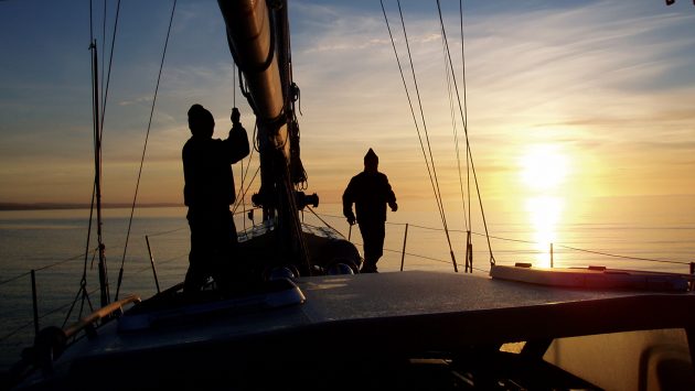 We were all in action a brief nanosecond before the expletive was ripped out of the Captain’s mouth and the boat was pushed down onto her side in a sudden vicious assault, pressed hard over until her sails were flat in the water and the top of the mast was downhill from my perch clinging tight to a sheet winch in the cockpit for dear life.