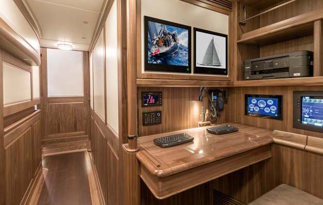 The decision was taken early during Svea’s build to incorporate furling headsails, for which a Reckmann torque tube is installed on deck. “It’s a big help not having to drag headsails out of the water,” van Ineveld remarked.