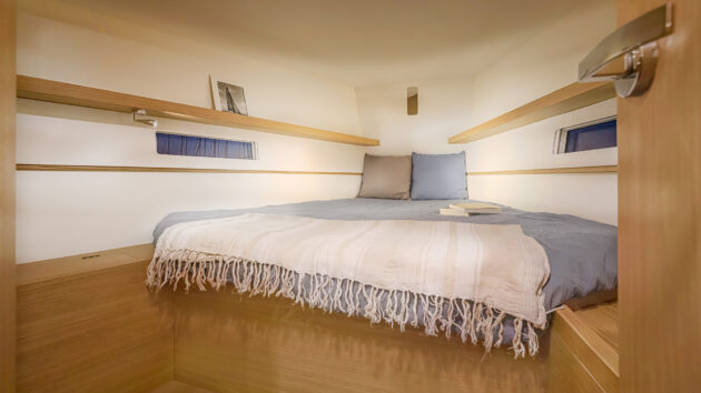 The forecabin berth is narrow at its forward end. Photo: Ludovic Fruchaud/imacis.fr