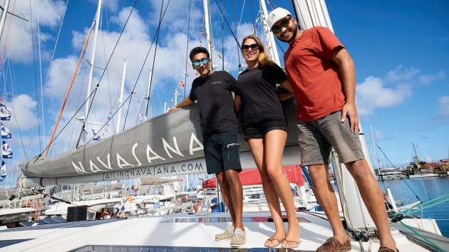 Chet Chauhan (left), Jessy and friend Dan on Navasana. Photo: James Mitchell/World Cruising Club