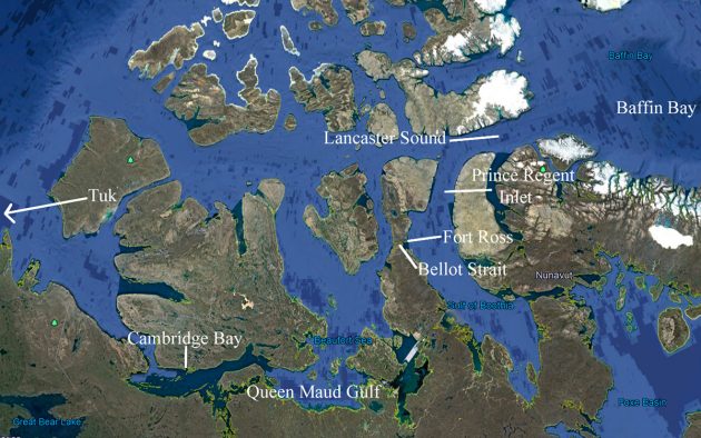 Cambridge Bay, farther on, is a crucial waymark for, should we meet ice that threatens to block our progress, it represents the last refuge for overwintering. And should we meet ice once we’ve passed that point we’d need to be certain we can retreat to Cambridge Bay as a safe haven.