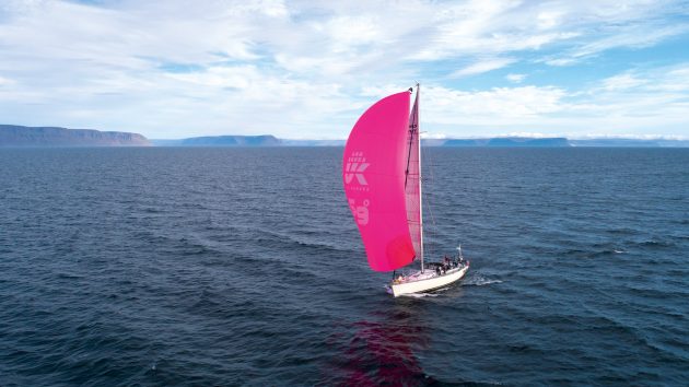 But the weather gods gave us our final gift of the passage just as land appeared on the horizon. A south-westerly sprung up in the afternoon, tempting us to hoist the kite and finish this epic adventure in style. Just as that iceberg had coaxed me into my drysuit and into the water, the beautiful 12-knot south-westerly put a little devil on my shoulder saying ‘Go on, get that chute up!’ The angel on my other shoulder instantly agreed, and so Falken sailed the last 50 miles into the Westfjords under her bright pink, 3,200ft2 S2, making 10 knots on an easy, flat sea, the crew taking turn to steer while I revelled in those last miles at sea, the best of a 3,000-plus mile voyage from Annapolis to Iceland.