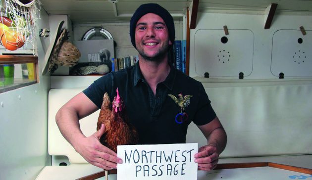 Adventurous young sailor Guirec Soudée and his adopted hen Monique sailing on Yvinec. Photo: Guirec Soudée