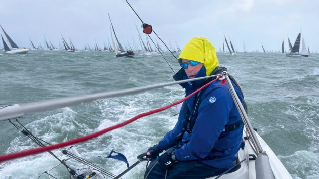 Justin at the helm on their exit from the Solent in the 2023 Rolex Fastnet Race. Photo: Christina Wolfe