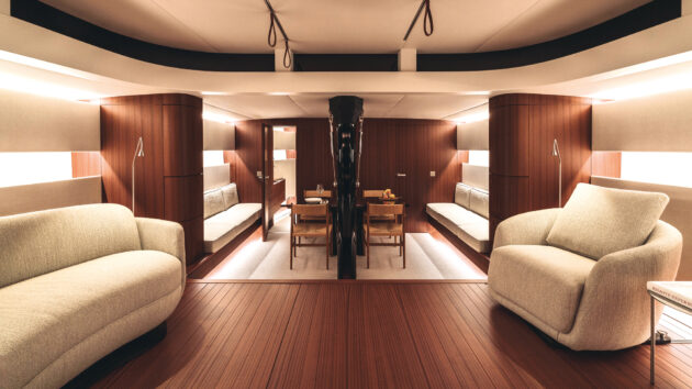 Like many of Schmidt’s boats, there’s a proper wow factor on stepping below decks, thanks to an ultra-clean architectural style.