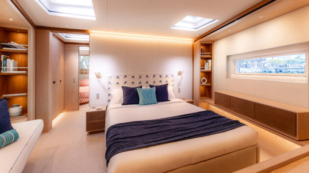 Pale fabrics and lots of natural light in the modest owner’s suite forward. Photo: Oriol Esteve/Photonautic